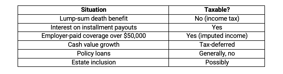 However, as this blog shows, there are certain situations where taxes can come into play — including interest earned on delayed payouts, estate tax considerations, employer-paid coverage through FEGLI, and cash value access in whole life insurance policies.